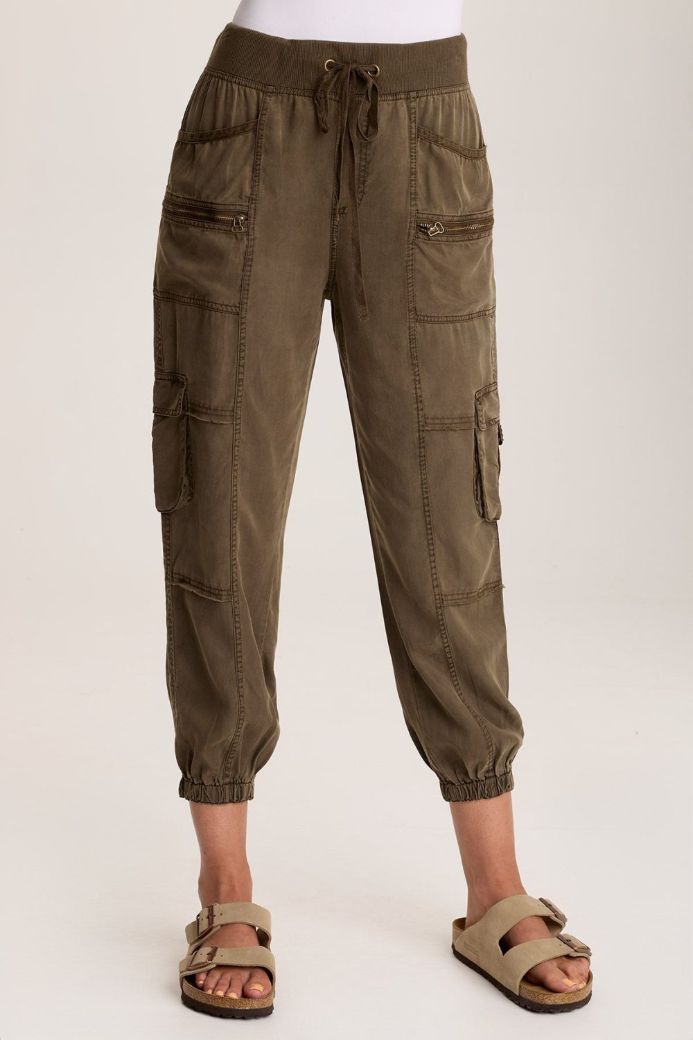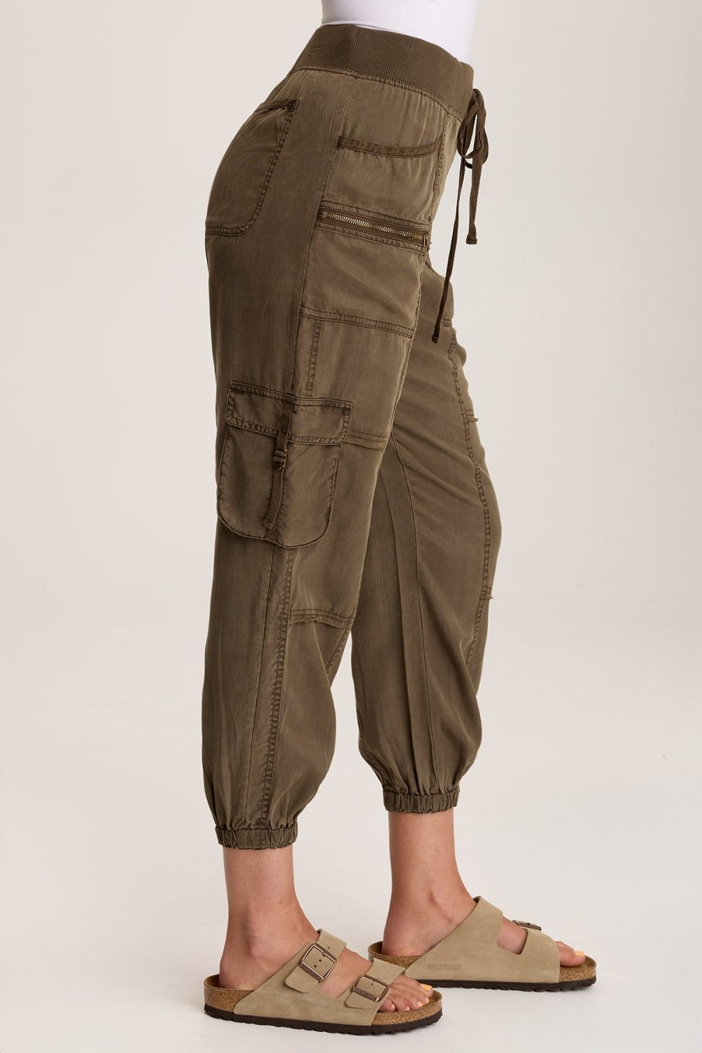 A soft twill crop with jogger-inspired banding at the leg opening and a pull-on waist. Hansa offers a classic cargo look, complete with plentiful pockets graced with antique brass hardware.
